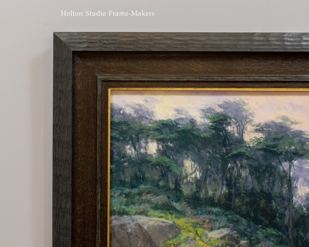 “The Mighty Earth” is the title of our new exhibit of larger paintings by our roster of artists. The display offers to an overheated world a bit of visual (and zero-emissions) air conditioning by master pastel artist Kim Lordier: an 18 x 24 painting of Pt Lobos titled “Misty Morn”. The painting is the work of one who loves the Earth—and in particular, Monterey pines. Kim’s admiration for these trees was a cue for the architecture of the frame, especially its form and texture: a carved cushion element at the outside edge aspires to join the canopy. The trees’ color was also inspiration for the frame. I echoed the artist’s cool greens and blue-greens with (solvent-free) linseed oil paint rubbed in to the coarse grain of the quarter sawn white oak frame. A gilt slip echoes the yellow and orange California poppies.