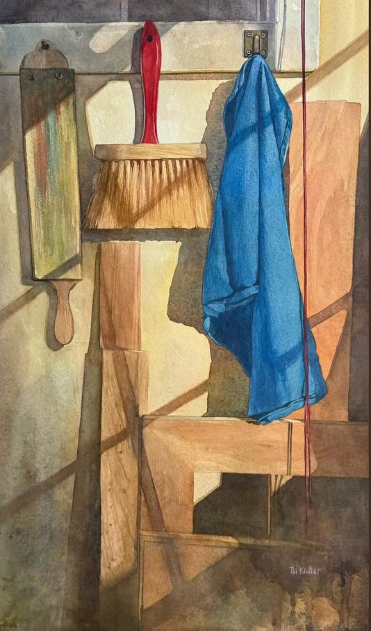 It’s not in the show, but I had to share this piece Tia just painted a few weeks ago, titled “Tools of the Trade,” (20″ x 12″). It shows a corner of my studio that caught Tia’s eye one day. (You’ll find it on the artist’s website.)