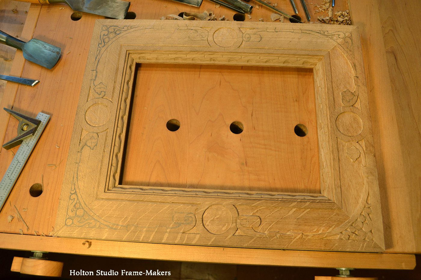 For shapes, circles were an obvious theme. The map’s engraver, Abraham Goos, defined the oceans by stippling, which is a technique also commonly found in strapwork cabinetry and that made sense to adopt for the frame. I carved the cove of the dramatic cut-in back with a decorative line and stippled the enclosed field.