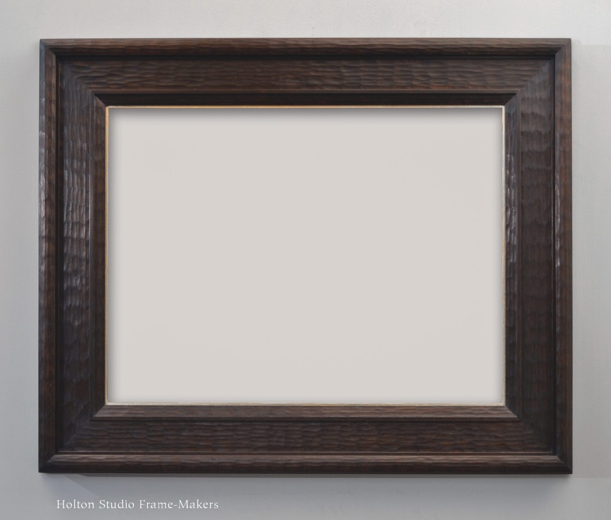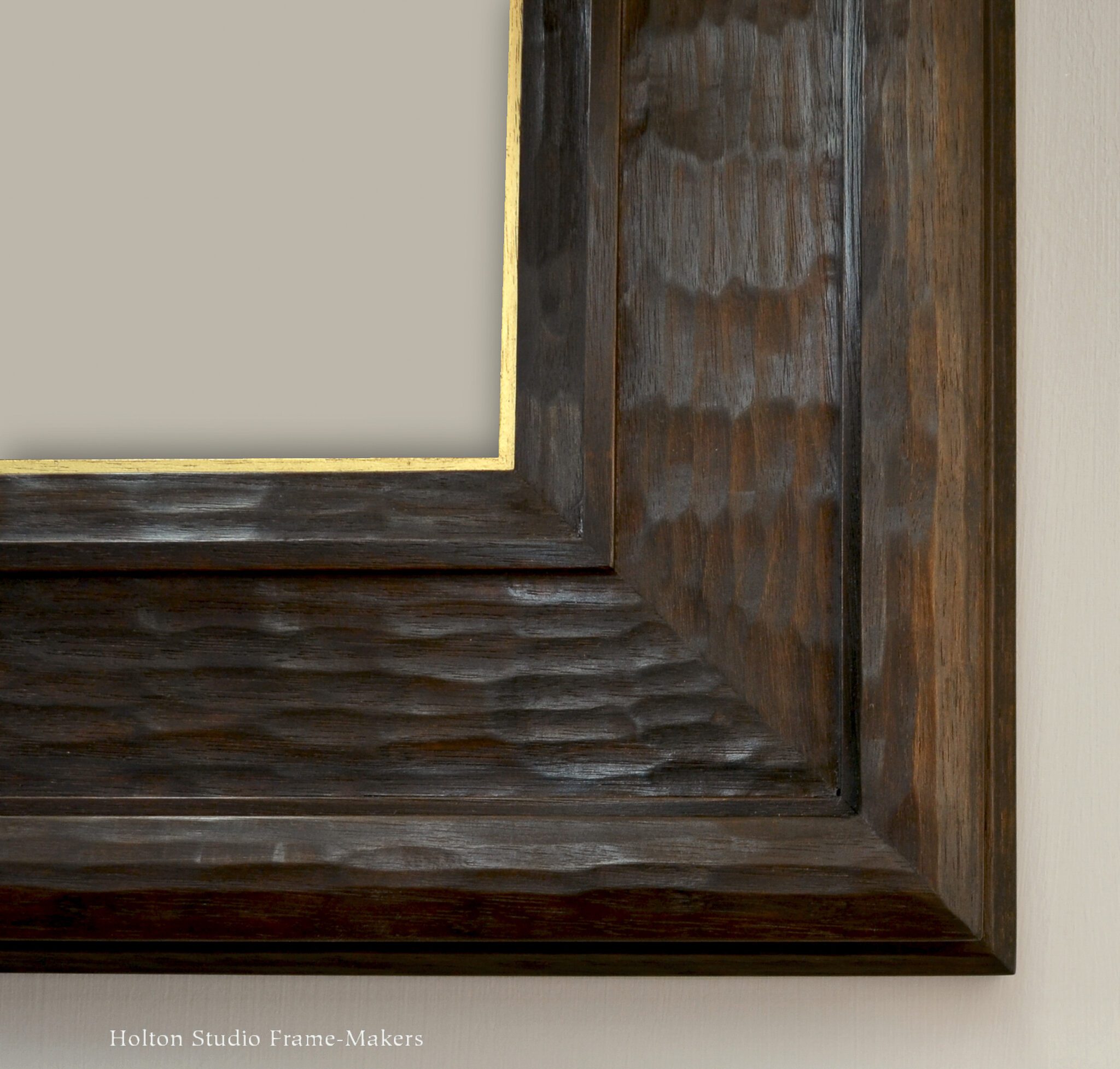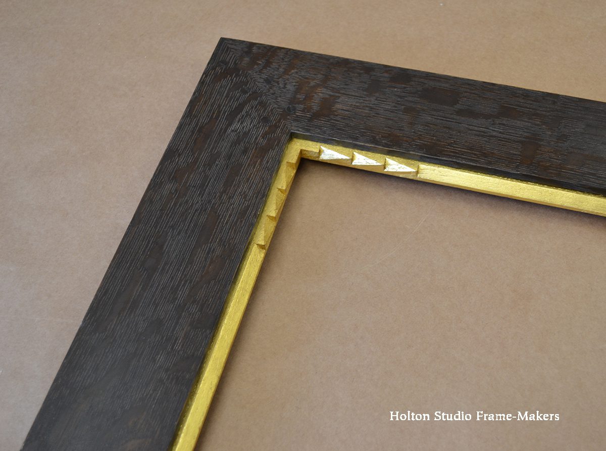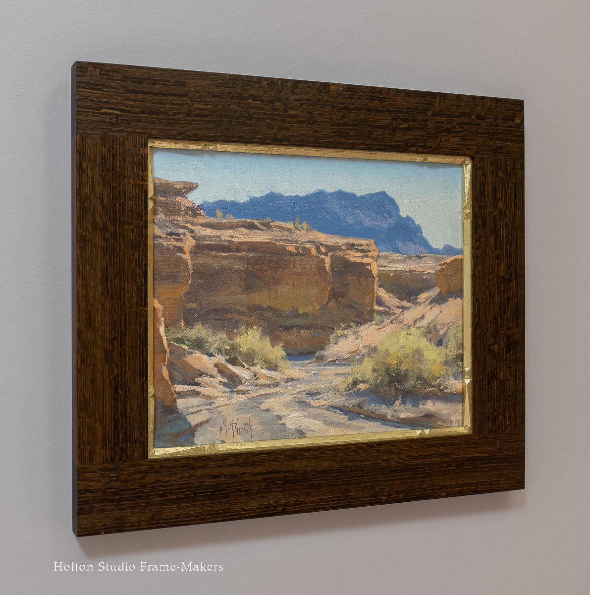 This first one is “Twilight Song in Amber,” 14 1/8″ x 19 1/2″. The frame is a No. 230—2 1/4″ in fumed quartersawn white oak with clear linseed oil finish, and an 18 kt gilt slip. One of the main ways a slope profile like this serves a picture is by enhancing perspective. With a view looking down a road or path or stream, a slope frame sustains the picture’s sense of depth and distance, helping it draw us in. And that’s precisely what Kim took advantage of here. She also enjoyed repeating and harmonizing the ochre-brown color—or dark amber referred to by her title?—of the fumed and oiled oak frame with the trees and shrubs in the shaded landscape. The muted, neutral tones of the frame enhance and intensify the rich colors in the picture. Also notice how she used the ray flake pattern in the wood of the frame to echo elements of the picture.