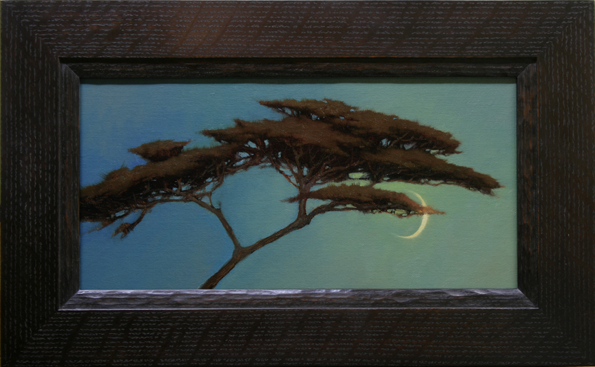 The last of Kevin Courter‘s paintings for his upcoming show, “From Dusk to Dawn,” is in, and it’s a great example of a theme he’s been having a lot of fun with for the last few months. This is called “Evening’s Solitude,” and it’s 8 x 16. The frame, No. 1.4 CV, is one we use often, as it’s so versatile, simple and effective.