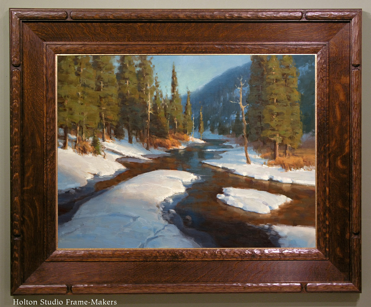 manufacturers produce closed corner frames, leafing the frames after joining. Holton Studio, however, works in the old “Cabinet-maker’s Frame” tradition—a legacy of ungilt (or minimally gilt) hardwood frames by furniture- and cabinet-makers that represents the origin of picture frames in Europe. Cabinet-makers’ frames are put together with the traditional expert methods of the professional joiner. Rather than relying on the dubious strength of nails and screws, traditional cabinet-makers’ frames were more likely than gilt frames to be joined with mortise & tenon, lap-joints and splines.