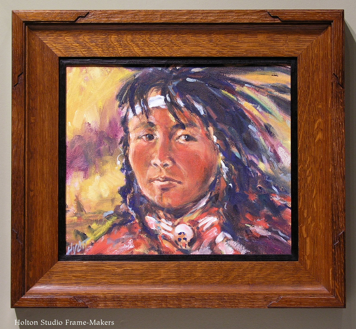 - Hyatt Moore painting, “Cheyenne Boy,” in carved corner frame
