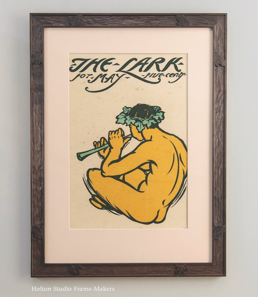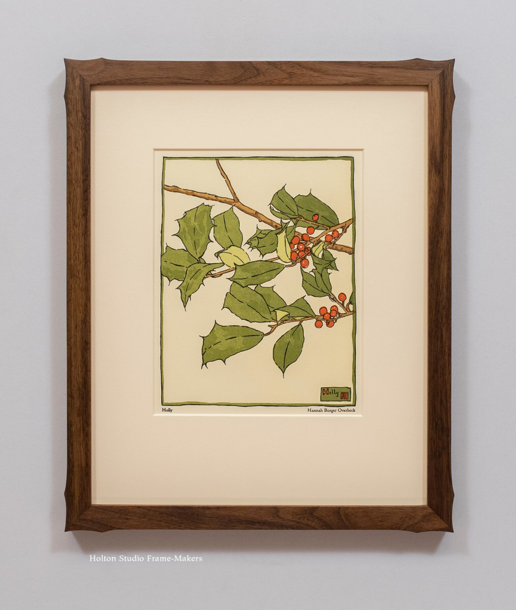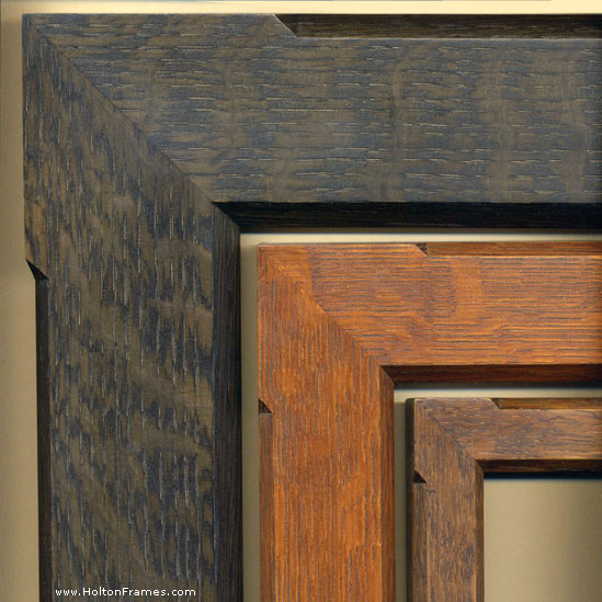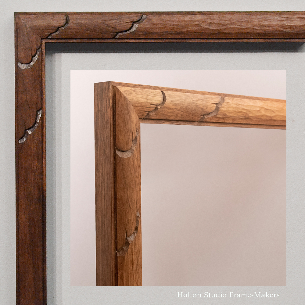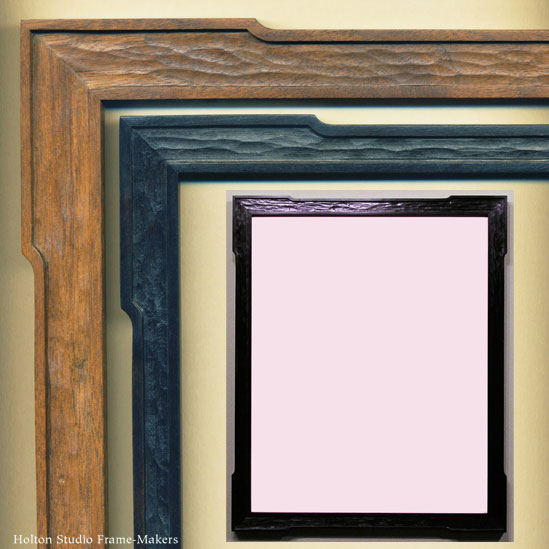 Below are examples of mitered frame designs featuring decorative corners, emphasizing a key source of the frame’s artistic beauty: the constructive significance of its joints. The infinite range of decorative opportunities the corners of the frame afford is one of the great benefits of closed-corner frames. For good reason, picture frame makers have traditionally found their chief expressive opportunities in embellishing the frame’s corners to emphasize the frame’s protective duty and function, as well as its unifying compositional role—the physical integrity of the frame and the evident care in how it’s put together being key to the elemental artistic concern for unity.