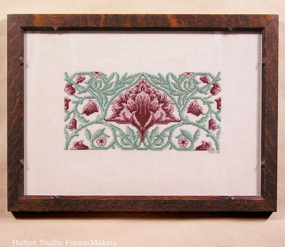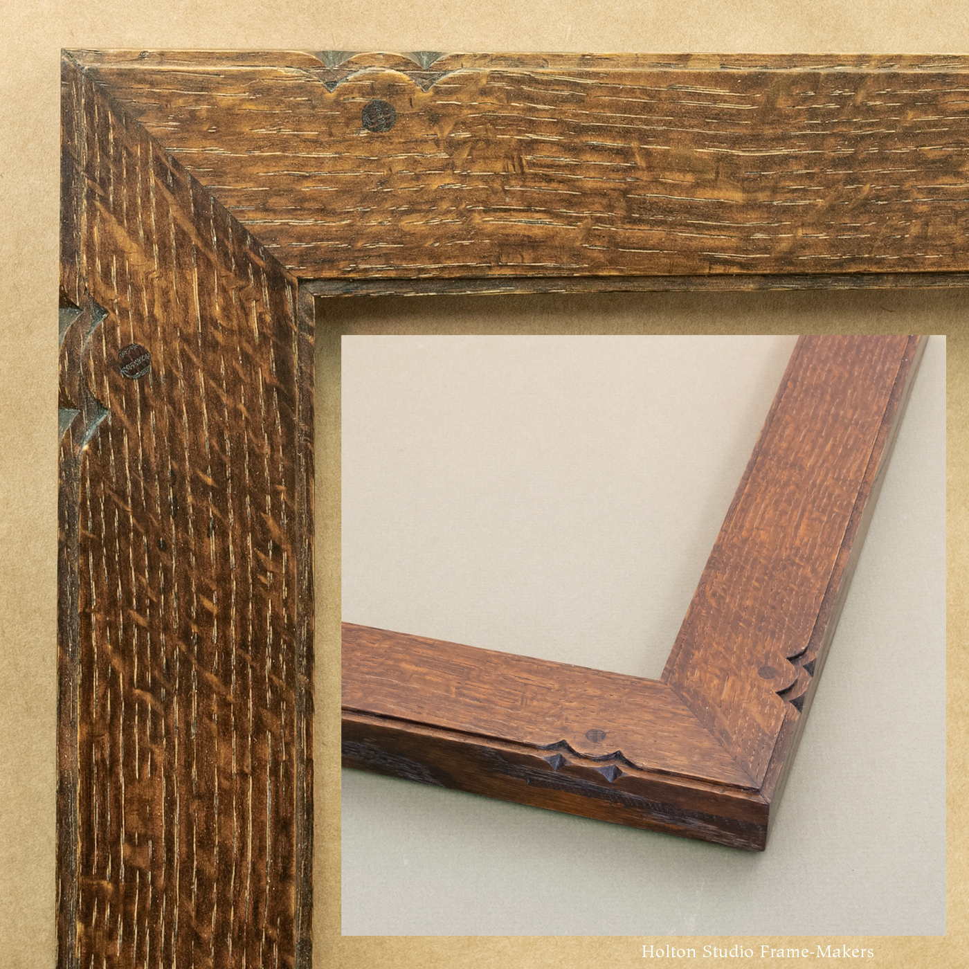 Our mitered frames are always joined with splines—triangles of wood inserted in slots cut through the joints. As do the joints of our through mortise-and-tenon frames, the splined corners of our mitered frames offer a simple opportunity to emphasize and enhance the inherent beauty of the frame’s joinery by exposing and giving slight relief to the main joining element—in this case the spline itself. The joint may be further accented with dowels that pin the joint—another constructive element with natural visual interest. This, then, is a good starting point for special decorative treatment of the corners.