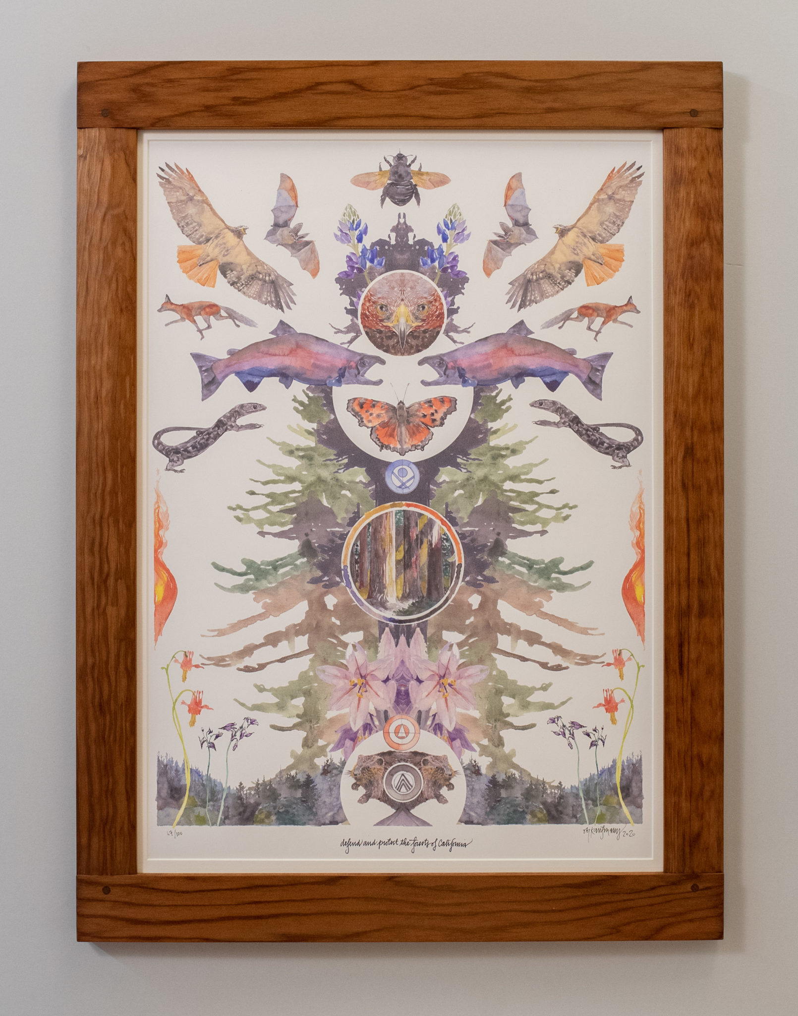 Poster, Edition: 67/100. 24″ x 18″. Framed in Custom No. 1000—2-1/4″ with carved sides. In redwood with clear finish.
