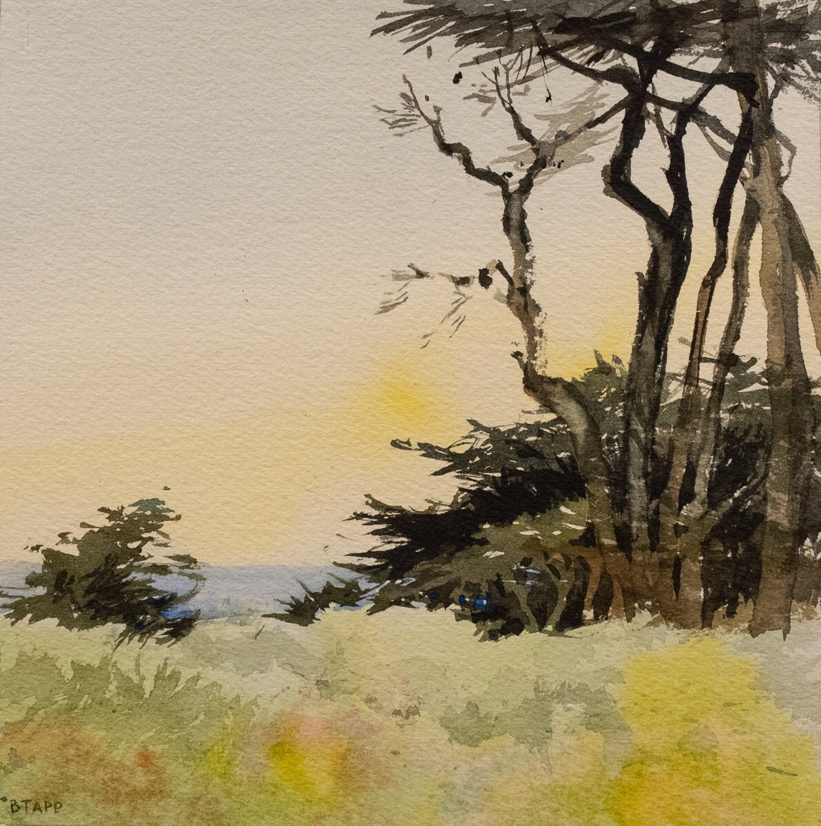 “Cypress #1. Lands End, CA.” 2020, watercolor, 7″ x 7″.