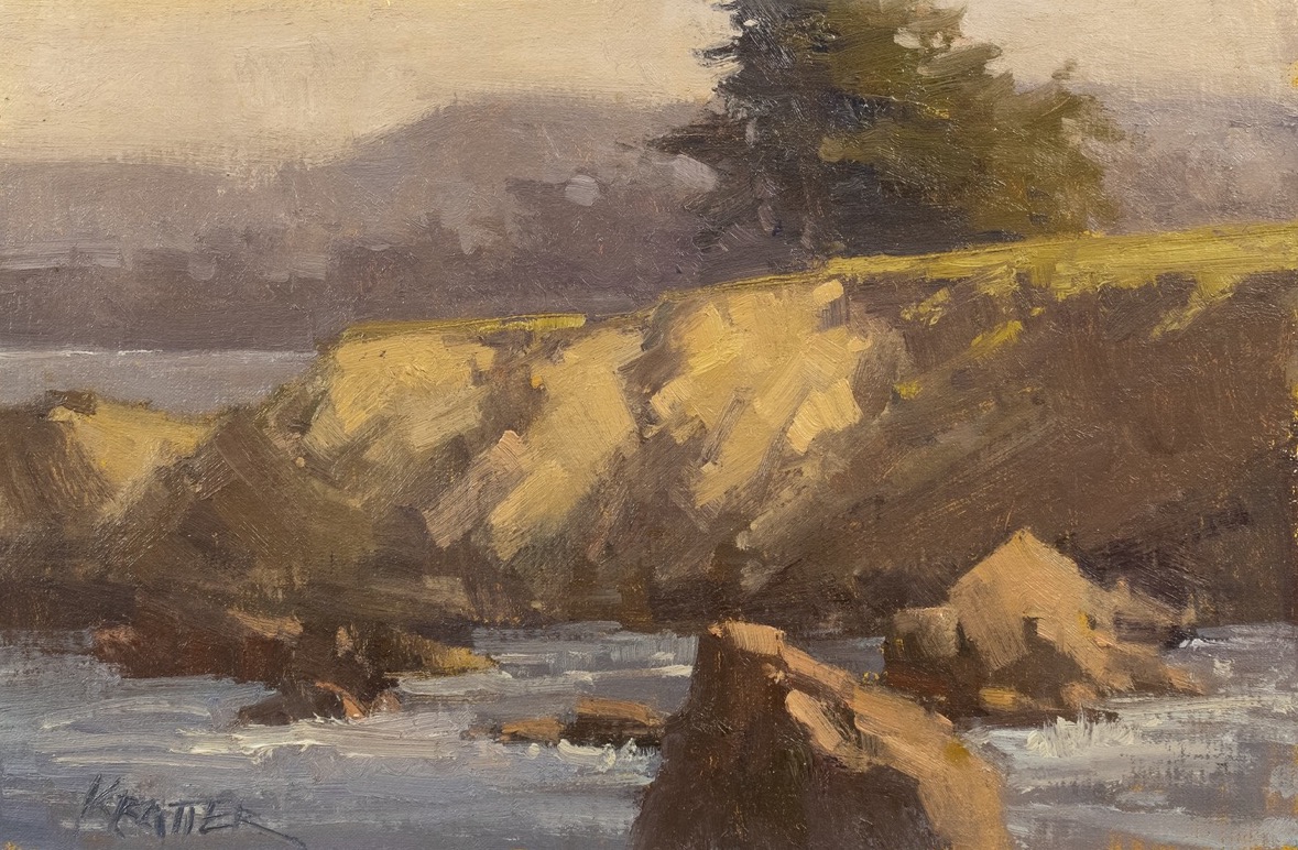 “50 Shades of Gray, Lovers Point.” 2020, oil, 8″ x 12″. $1,000 unframed.