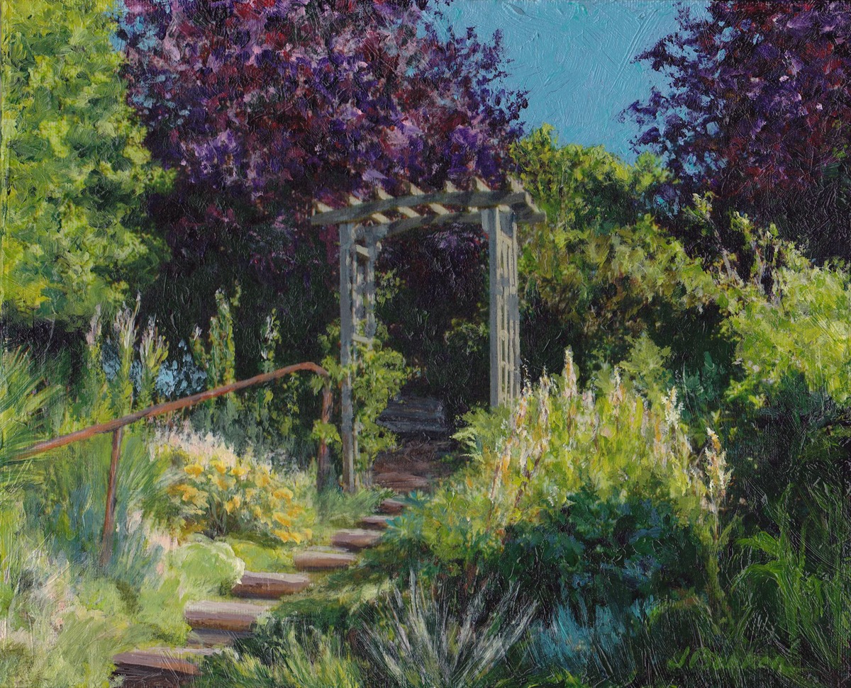 - Janet Arline Barker, Peaceful Pathway Acrylic on canvas, 8″ x 10″. $600 framed.