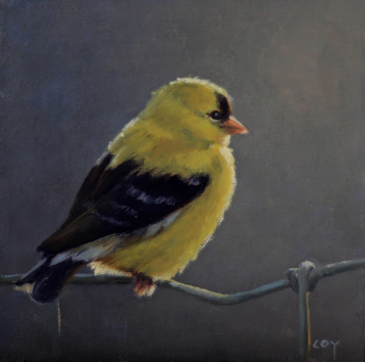 - Christin Coy, Little Yellow GoldfinchOil on panel, 6″ x 6″. SOLD.