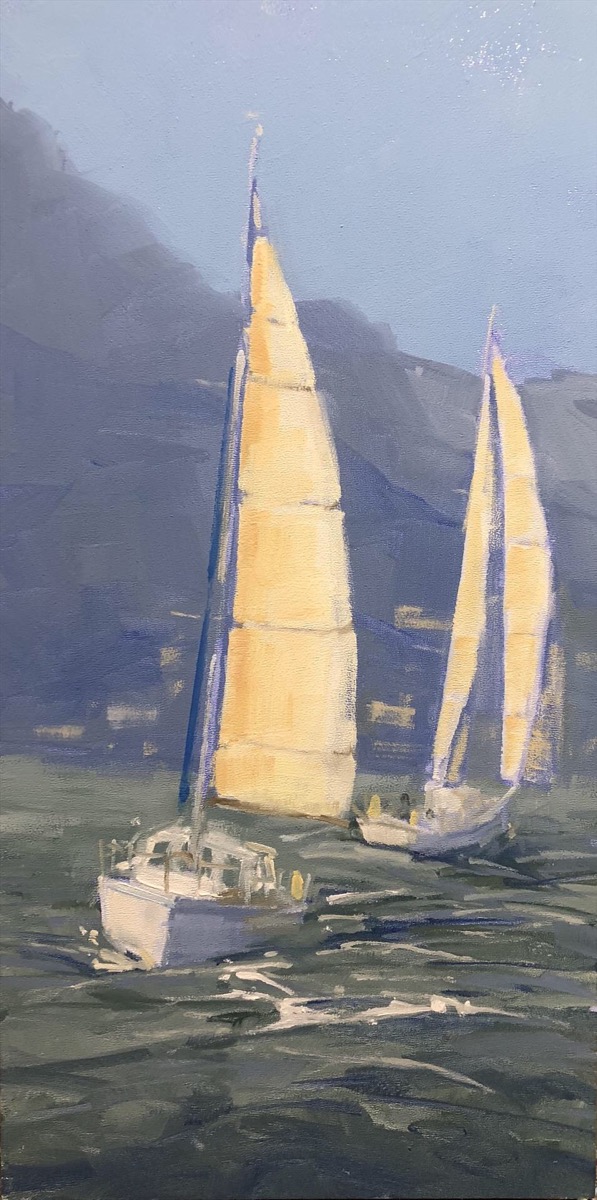 - Joseph McFadden, Two Sails on San Francisco Bay Oil, 12″ x 6″. SOLD.