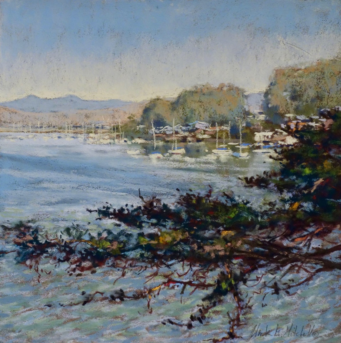 - Clark Mitchell, Morro Bay Harbor Soft Pastel, 11″ x 11″. $1,400 framed.