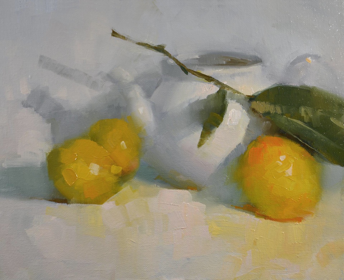 - Carol Tarzier, Lemons with White Oil on linen panel, 9″ x 11″. $875 framed.
