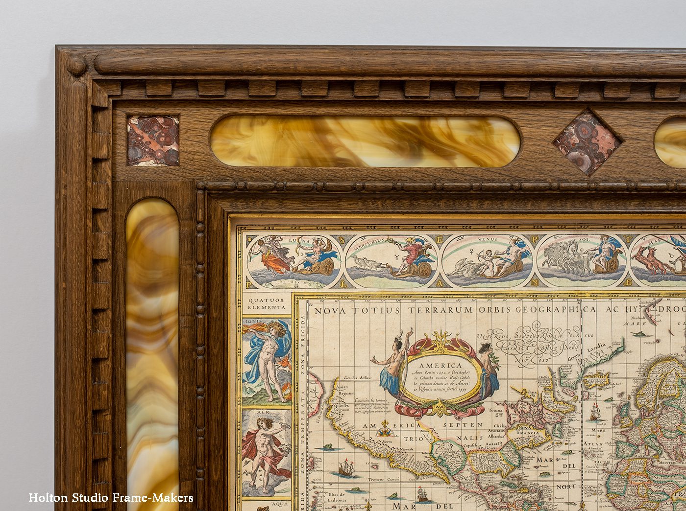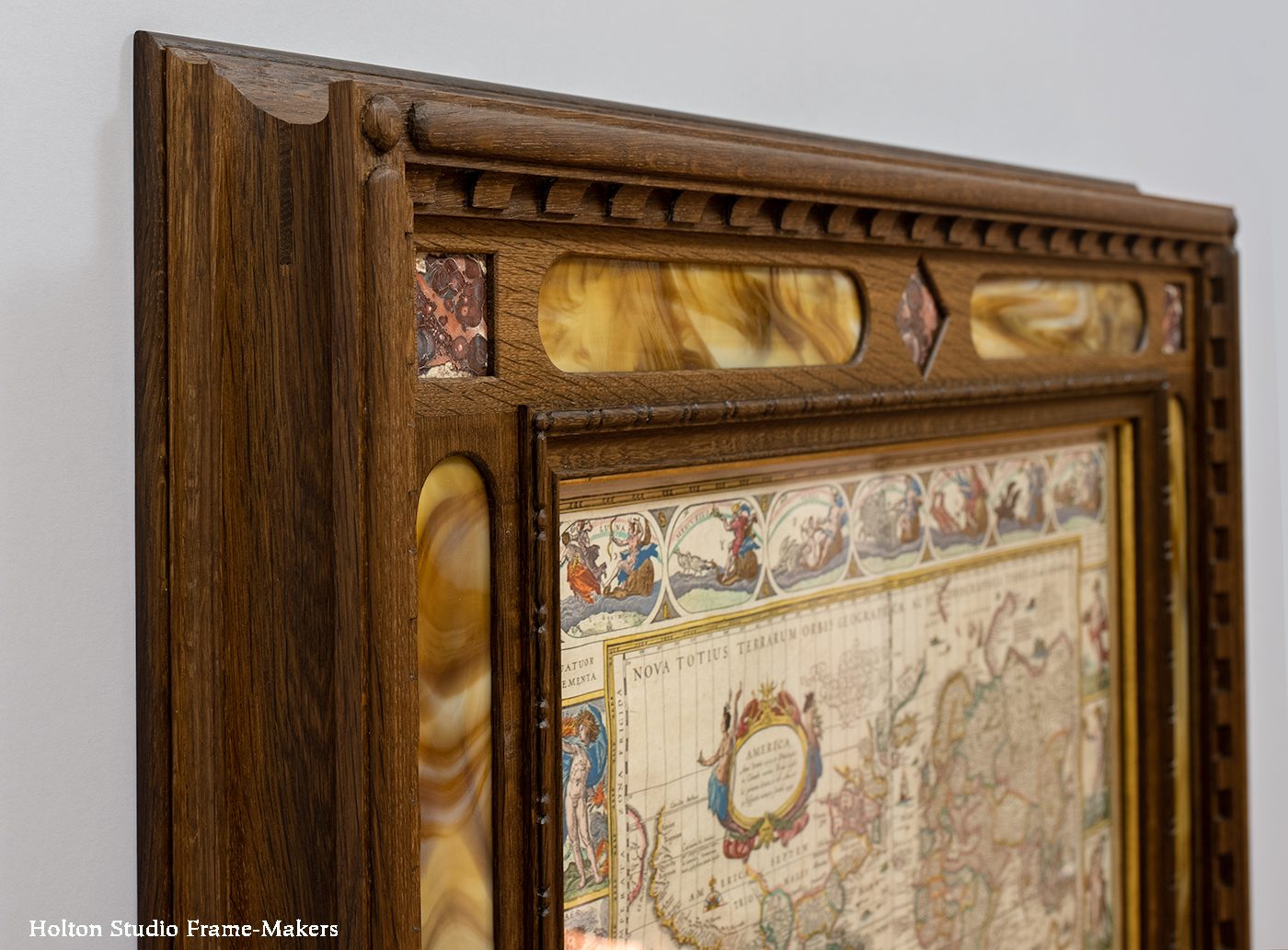 1606/1640’s. Willem Blaeu (Dutch, 1571-1638), world map. 17″ x 22″. Special carved Cassetta, with inlaid stones, including stained glass and jasper. In fumed quartersawn white oak.